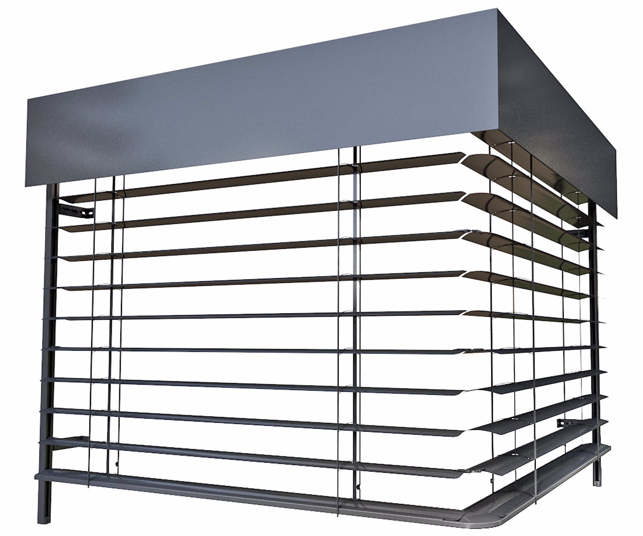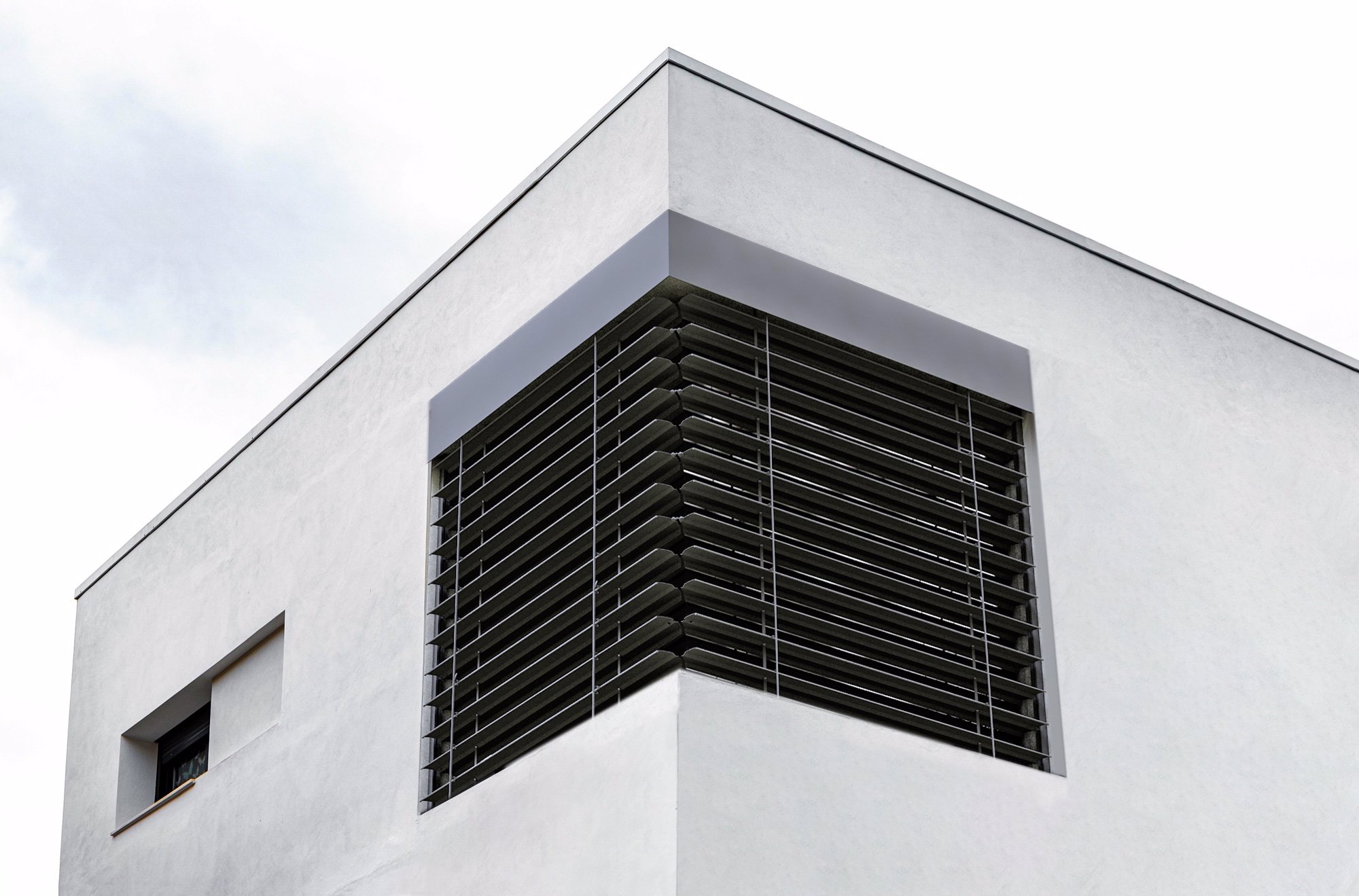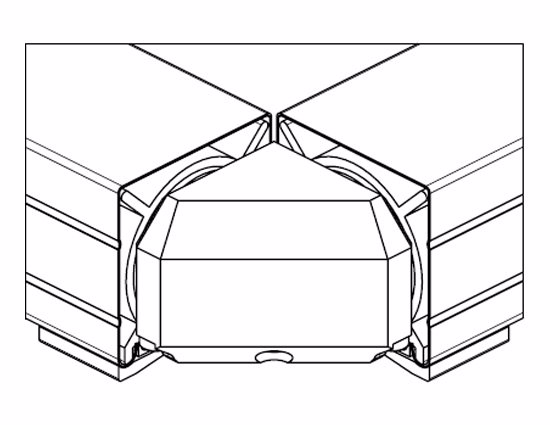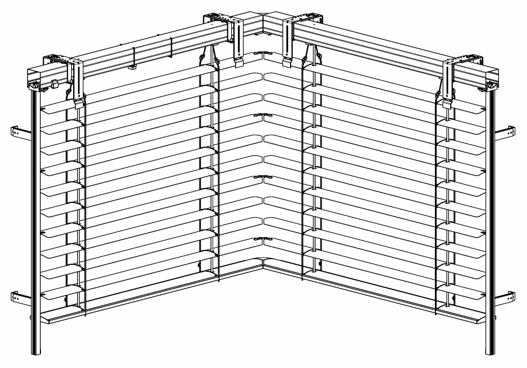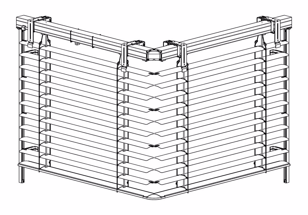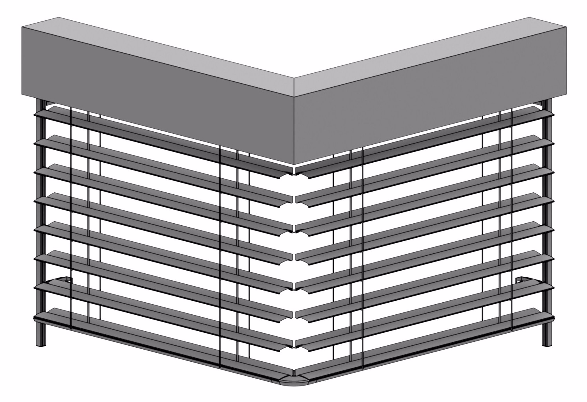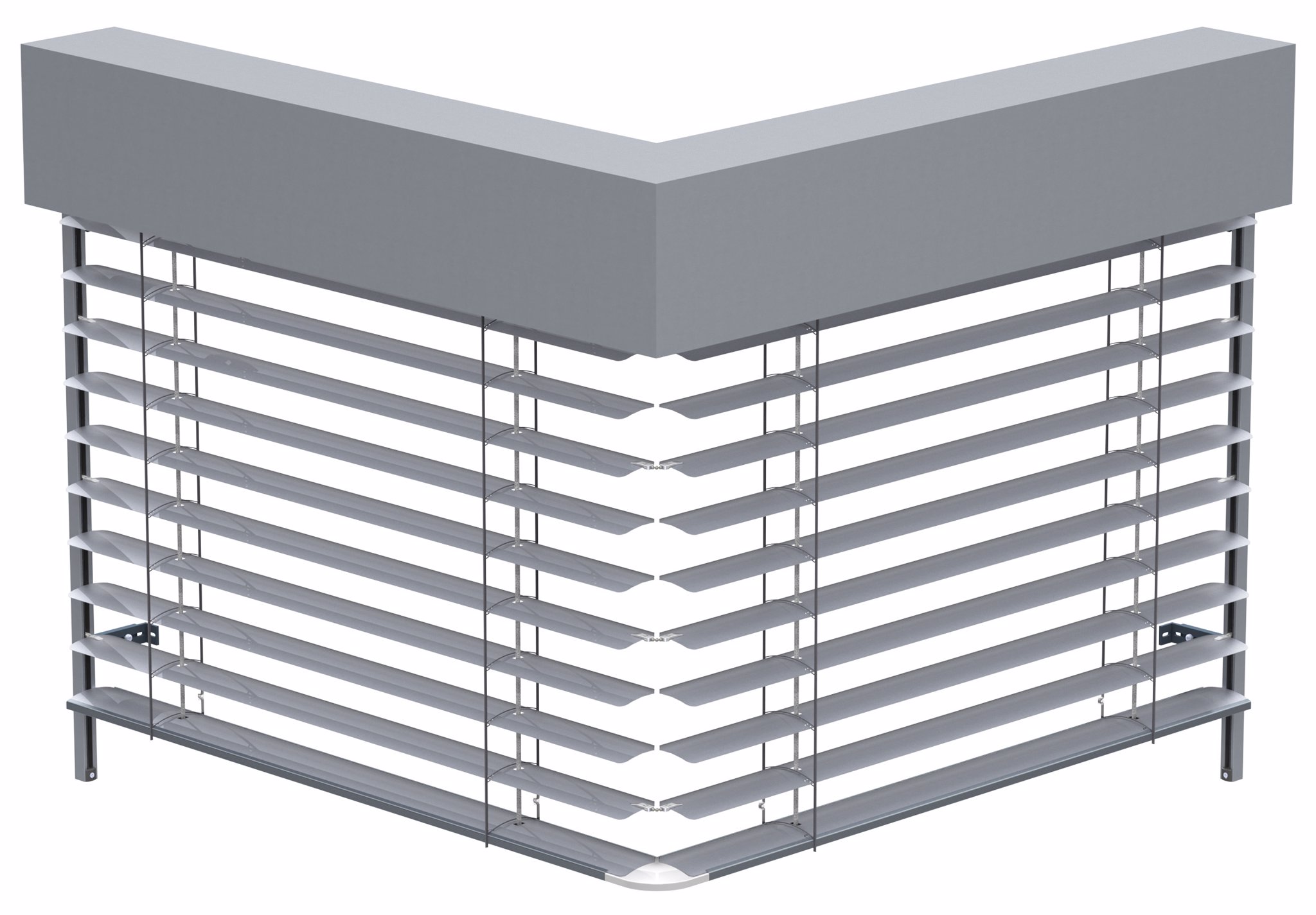 Rohová venkovní žaluzie ve spřaženém provedení je nejlepším řešením pro rohové portály domů a budov. Tento produkt mimo jiné řeší problém zastínění rohových oken bez toho, aniž by ve středu zůstávala vodící lišta a po vytažení žaluzie rušila celkový pohled z interiéru ven. Spojení lamel je realizováno nerezovým kuličkovým řetízkem v plastovém vodítku. Spojení profilů spodních lišt je provedeno kovovým úhlovým dílem zasunutým v plastovém rohu. Rohovou žaluzii lze použít pro vnější i vnitřní roh, avšak vždy pouze pro úhel 90°!