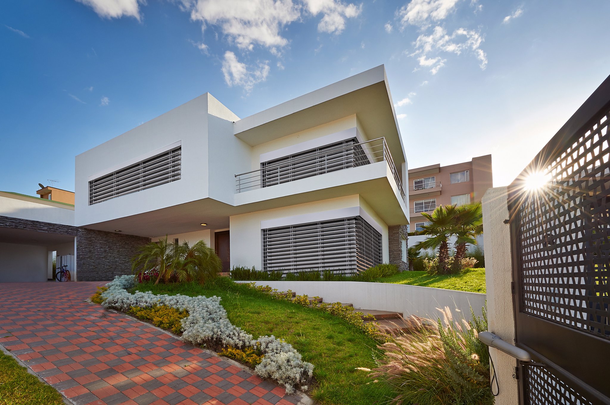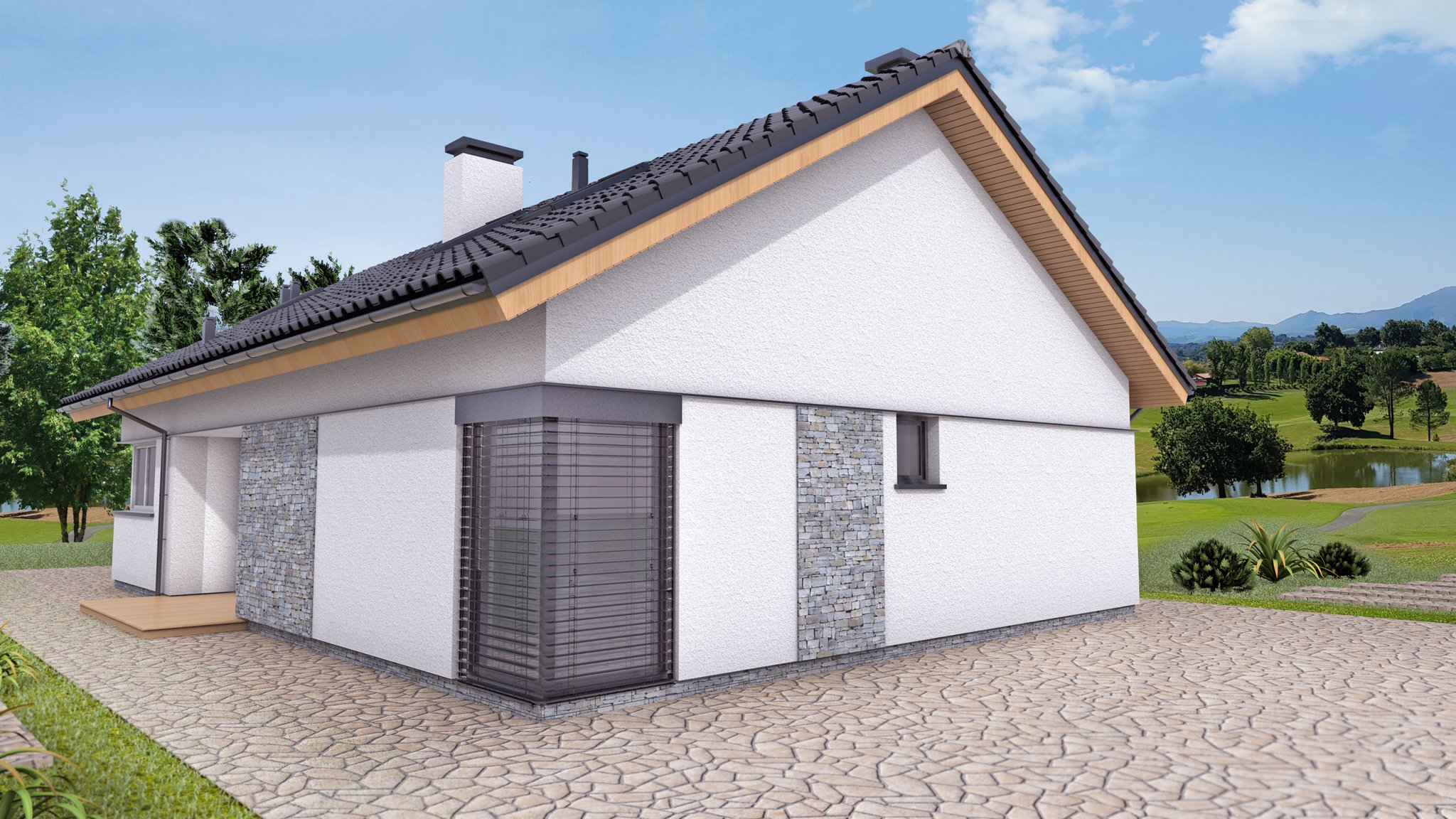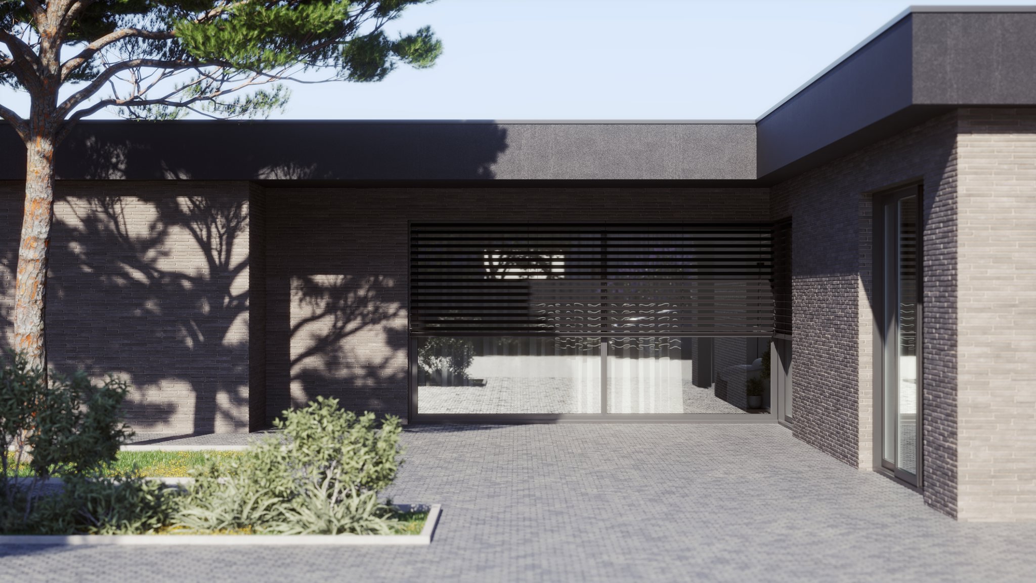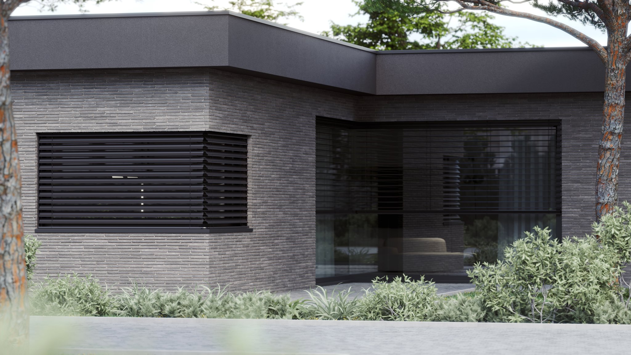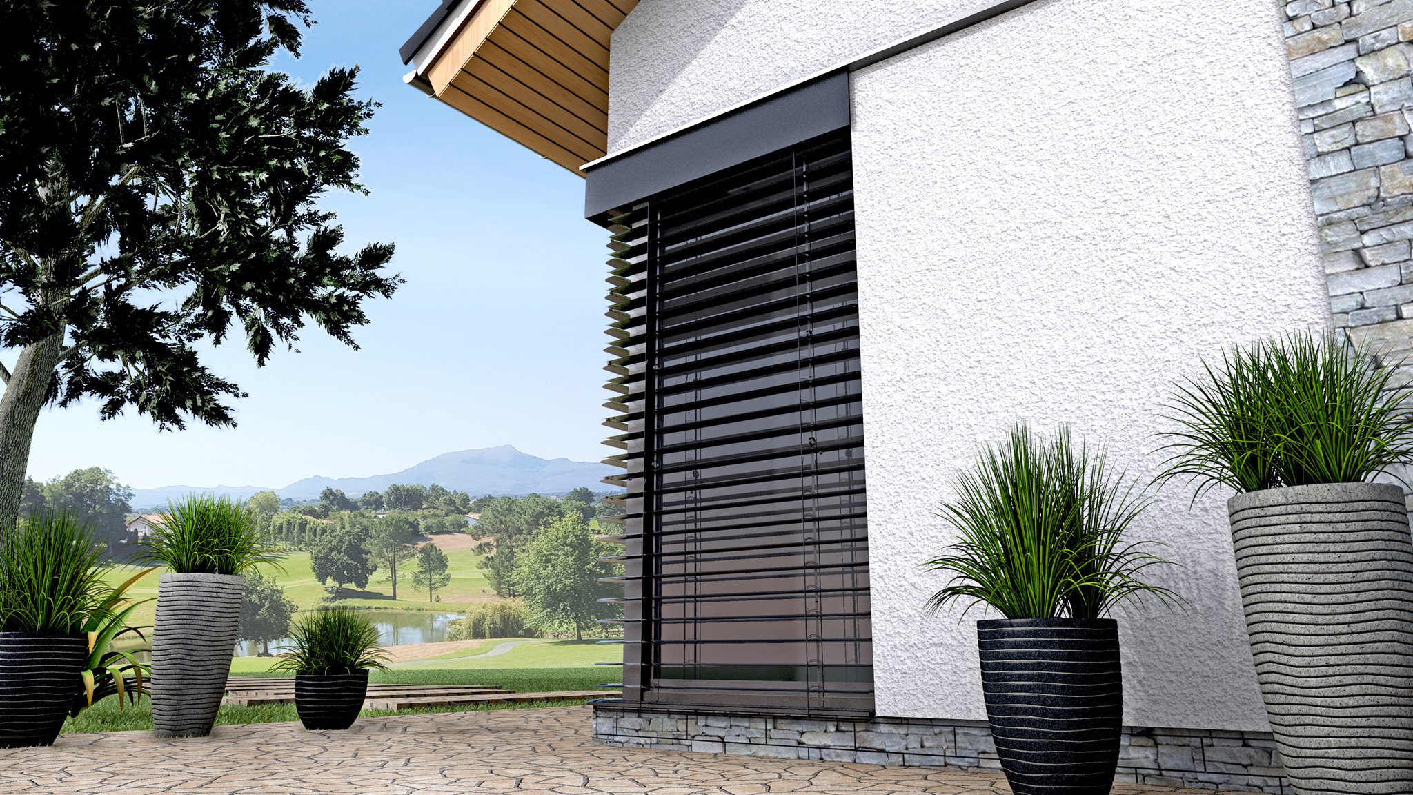 Rohová venkovní žaluzie ve spřaženém provedení je nejlepším řešením pro rohové portály domů a budov. Tento produkt mimo jiné řeší problém zastínění rohových oken bez toho, aniž by ve středu zůstávala vodící lišta a po vytažení žaluzie rušila celkový pohled z interiéru ven. Spojení lamel je realizováno nerezovým kuličkovým řetízkem v plastovém vodítku. Spojení profilů spodních lišt je provedeno kovovým úhlovým dílem zasunutým v plastovém rohu. Rohovou žaluzii lze použít pro vnější i vnitřní roh, avšak vždy pouze pro úhel 90°!
